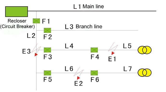 The recloser applied in the substation is set( “1 fast and 2 slower’)3 shots to lockout and 6 unitscutout sectionalizers (F1, F2, F3, F4, F5, F6) are applied in the four branch line to separate 7 section( L1, L2, L3, L4, L5, L6, L7). The counts of F1 is set to 3 time, F2, F3, F5, are set to 2 times and F4,F6 are set to 1 times.
