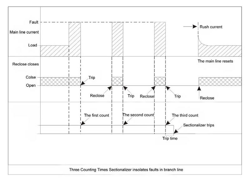 First, the faults current exceeds presetting pickup current. Second, the counting time reaches presetting value (1, 2, 3 or 4). Third, the circuit loses voltage and the current is lower than 300mA. The Sectionalizer will trip automatically if the aforesaid conditions occur simultaneously. If any of aforesaid conditions doesn’t occur, the Sectionalizer will not trip automatically.