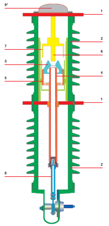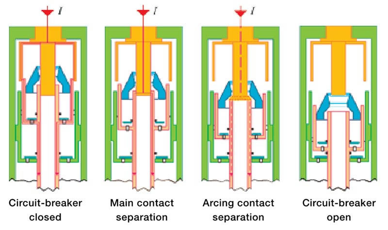 The arc has been extinguished, the self-generated pressure in the upper volume decreases because the gas is flowing through the contacts. The valve re-opens and a new jet of fresh gas flows in and “washes” the chamber. This means the apparatus is immediately ready to close and trip again up to its maximum breaking capacity.