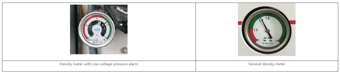 Each tank of RMU is equipped with density meter to monitor the gas pressure inside. The pointer of the meter is in the green area, that means the normal pressure in the gas tank, if the pointer is in the red zone, it means the pressure of the tank is low. It is required to periodically inspect the density meter, to ensure the pressure in the normal range. Additionally, density meters with low pressure alarm is also available as an option. The meter is provided as the customer specified.