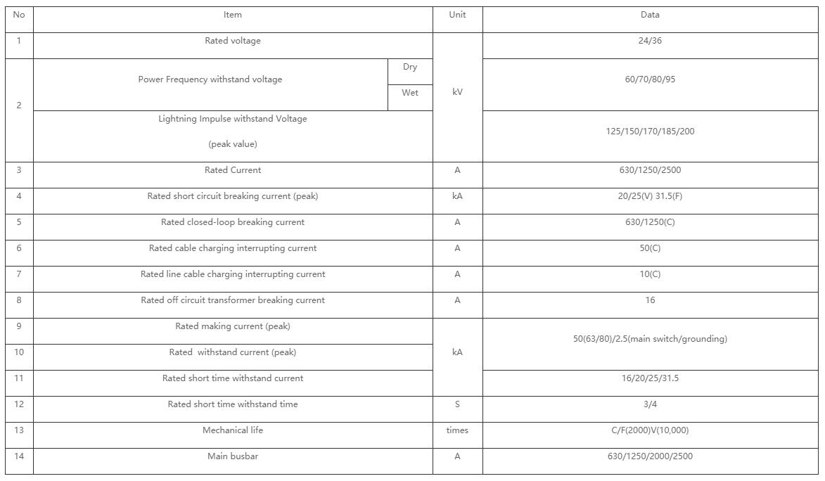 Technical data of 30kV 33kV 36kV 40.5kV SF6 gas insulated ring main unit