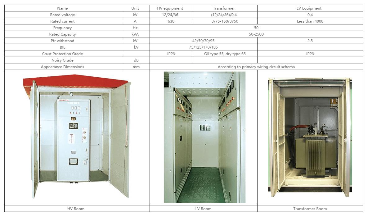 YB() series products is a kind of set of equipment which assembles the MV switch apparatus, transformer, LV distribution equipment together according to fixed connection scheme. This series substation is suitable for neighborhood unit, hotel, large-scale work site and high building that the voltage is 12kV /24kV/36kV/40.5kV, the frequency is 50Hz and the capacity is under 2500kvA.