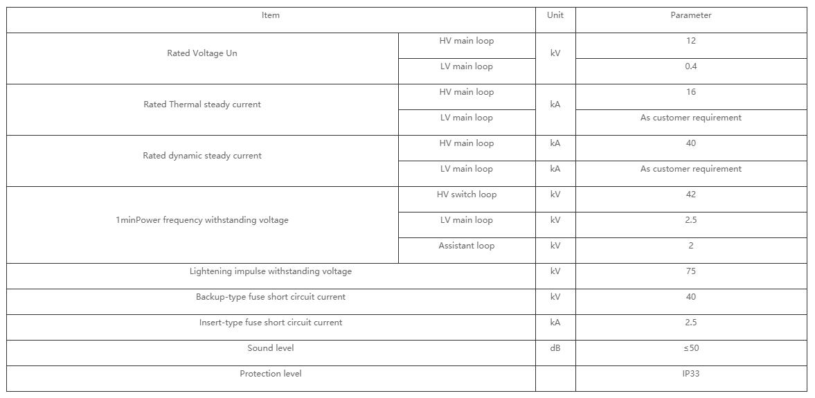 Main technical specifications for 36kV/40.5kV Prefabricated Substation