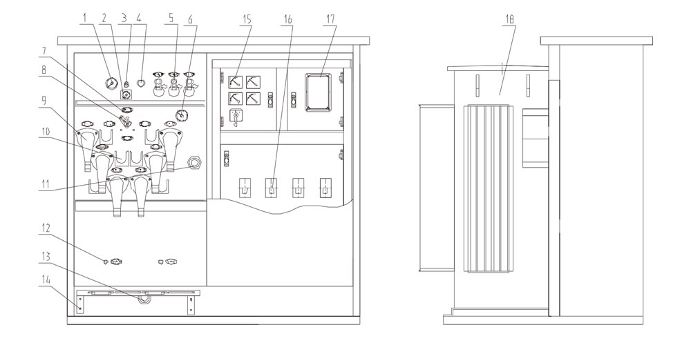 HV:1.Manometer; 2.Oil level gauge; 3.Air valve; 4.Oiling plug; 5.Fuse; 6.Thermometer; 7.Load switch operation indicator plate; 8.Load switch; 9.HV cable contactor; 10.Hanging; 11.Tap changer; 12.Earthing&earthing label;13.Dual-purpose valve; 14.HV cable bracket.