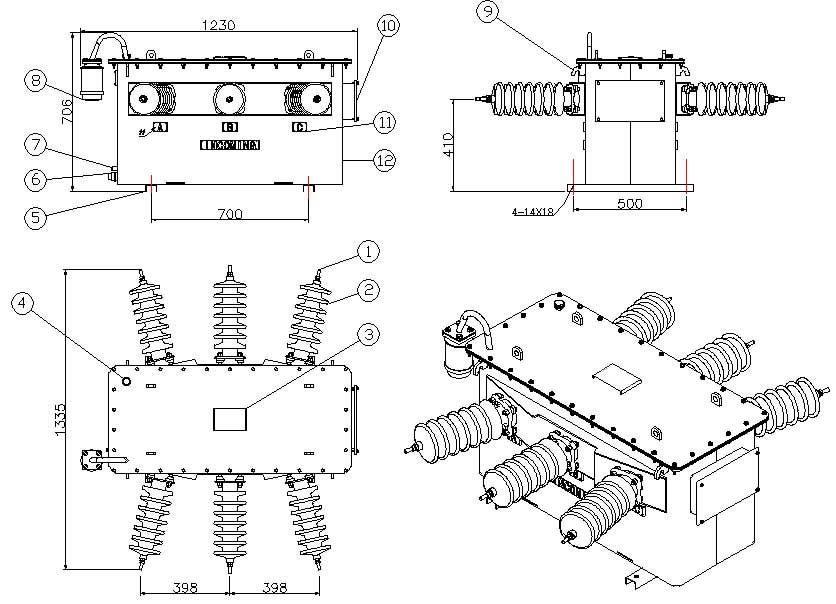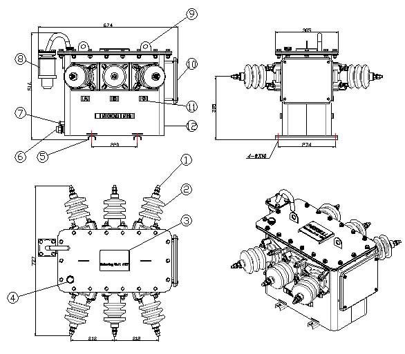 5. Porcelain jacket by conductive bars will lead to a supply voltage, current transformers with wiring. Voltage and current transformers are fixed on the pallet, the pallet support bar by lifting the lid on, and immersed in transformer oil.