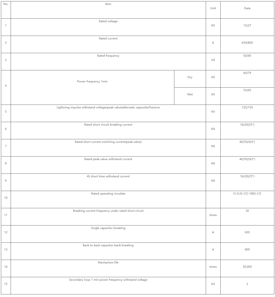 For 15kV, with 630A, 20kA Breaking capacity. 800A, 20kA capacity, and 1250A, 20kA.